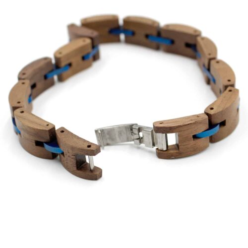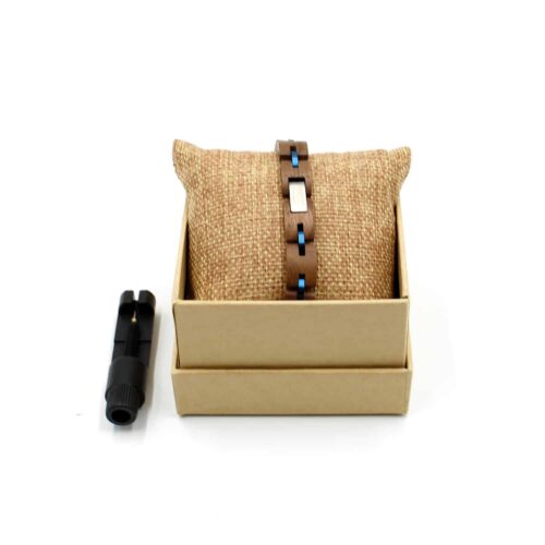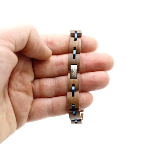 Das Akebono Armband von Woed ist eine schöne Kombination aus Edelstahl und Holz, die sowohl für Damen als auch für Herren entworfen wurde. Der mittlere Teil des Armbands ist aus blauem Edelstahl gefertigt, der zusammen mit dem Walnussholz eine stilvolle und starke Verbindung zwischen den Gliedern bildet. Mit einer Gliederbreite von 11 mm und einer Gesamtlänge von 220 mm (22 cm), passt dieses Armband perfekt an jedes Handgelenk.
