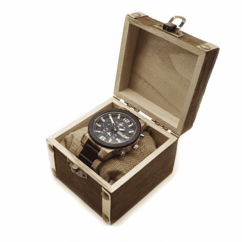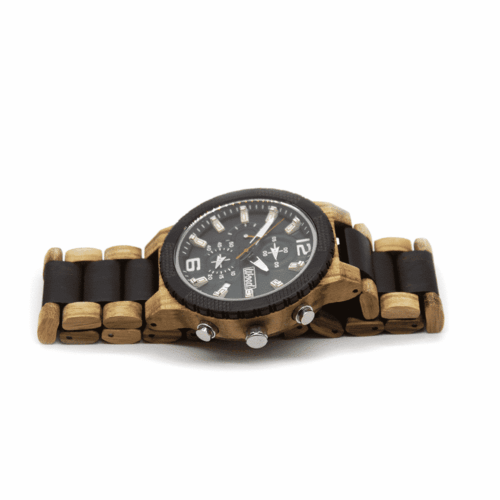 Schöne Uhr aus Zebrano-Holz. Die Uhr hat eine Dicke von 13 mm und eine Breite von 48 mm. Die Uhr gehört unter Woed Premium-Uhren. Das bedeutet, dass es sich um eine sehr luxuriöse und handgefertigte Uhr handelt, deren Mechanismus ein Multifunktionswerk ist, d.h. alle Zeiger arbeiten! Das Gewicht der Uhr beträgt 63 Gramm.