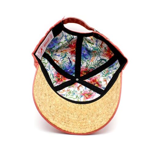 De binnenkant van de pet is voorzien van een opvallend hagediskunstwerk dat een extra leuk element toevoegt aan het ontwerp. De onderrand van de pet is gevoerd met een laagje kurk, wat hem een unieke touch geeft en bovendien extra comfort.