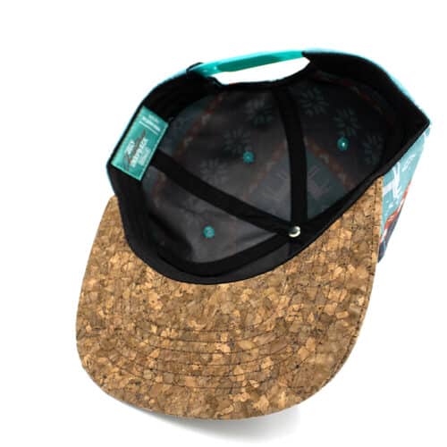De klep is volledig afgewerkt met een donkerbruine kurklaag, zowel aan de boven- als onderkant. Hierdoor krijgt de cap een unieke natuurlijke look die perfect contrasteert met het speelse ontwerp van de stof. Op de voorkant prijkt een hoogwaardige geweven patch met het iconische Woed-logo, subtiel maar toch duidelijk aanwezig.