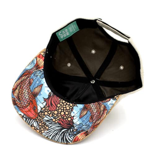 Wat deze cap écht bijzonder maakt, is de korken klep. De bovenkant is voorzien van een lichtbruine kurklaag, wat zorgt voor een natuurlijke en moderne look. Aan de onderzijde vind je een indrukwekkende Japanse karper-artwork – een detail dat kracht, doorzettingsvermogen en stijl uitstraalt.