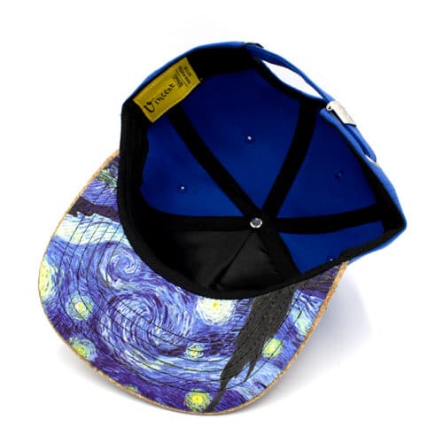 De bovenkant is afgewerkt met een stijlvolle lichtbruine kurklaag, wat zorgt voor een natuurlijke, moderne uitstraling. Onder de klep vind je een waar kunstwerk: De Sterrennacht van Vincent van Gogh – één van ’s werelds beroemdste schilderijen. Dit meesterwerk uit 1889, geschilderd in olieverf en onderdeel van de permanente collectie van het MoMA in New York, geeft de pet een artistieke en tijdloze uitstraling.