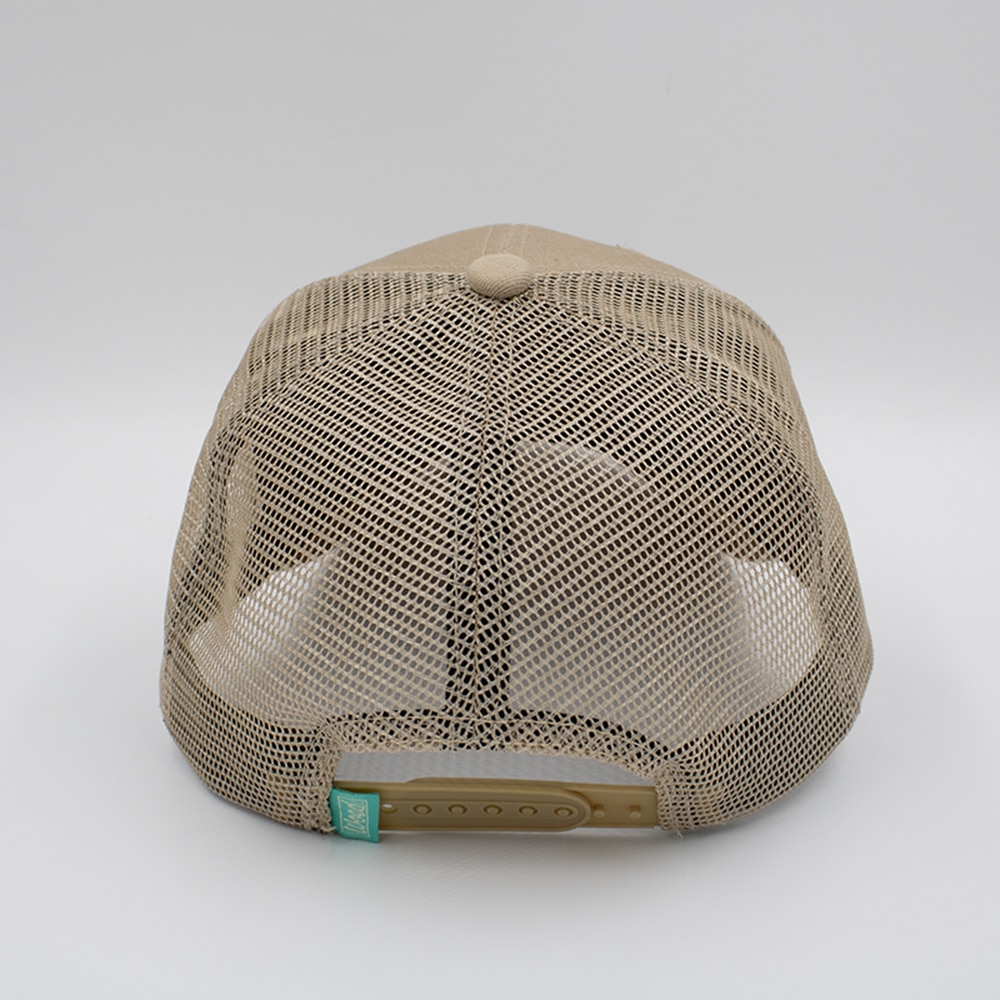 De achterzijde is voorzien van ademend zandkleurig mesh (gaas), waardoor de cap luchtig en comfortabel blijft, zelfs op warme dagen. Dankzij de verstelbare sluiting aan de achterkant is de pet eenvoudig op maat te maken voor iedere pasvorm.