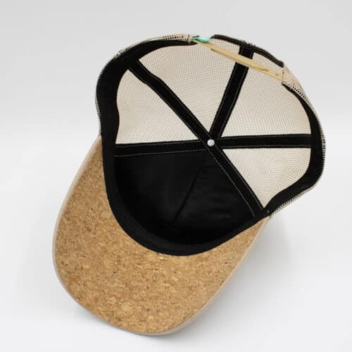 De voorkant en bovenkant van de klep zijn uitgevoerd in hoogwaardig zandkleurig katoen, wat zorgt voor een rustige en moderne uitstraling. De onderzijde van de klep is afgewerkt met een subtiele, lichtgekleurde kurklaag – een kenmerkend detail dat deze cap onderscheidt van standaard petten.