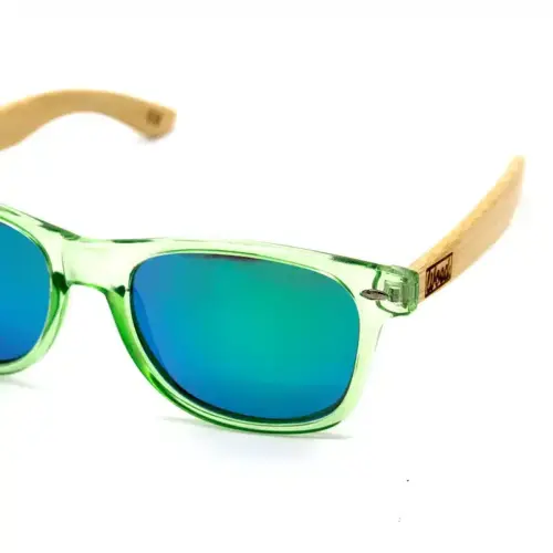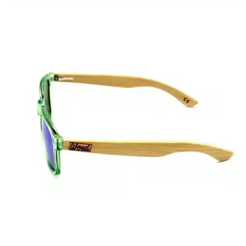 Introducing: Hemlock, de ultieme metgezel voor zonnige dagen! De Woed wayfarer zonnebril is een sublieme combinatie van stijl en functionaliteit. Met zijn doorzichtige groene plastic frame en lichtbruine houten pootjes straalt hij een natuurlijke elegantie uit.