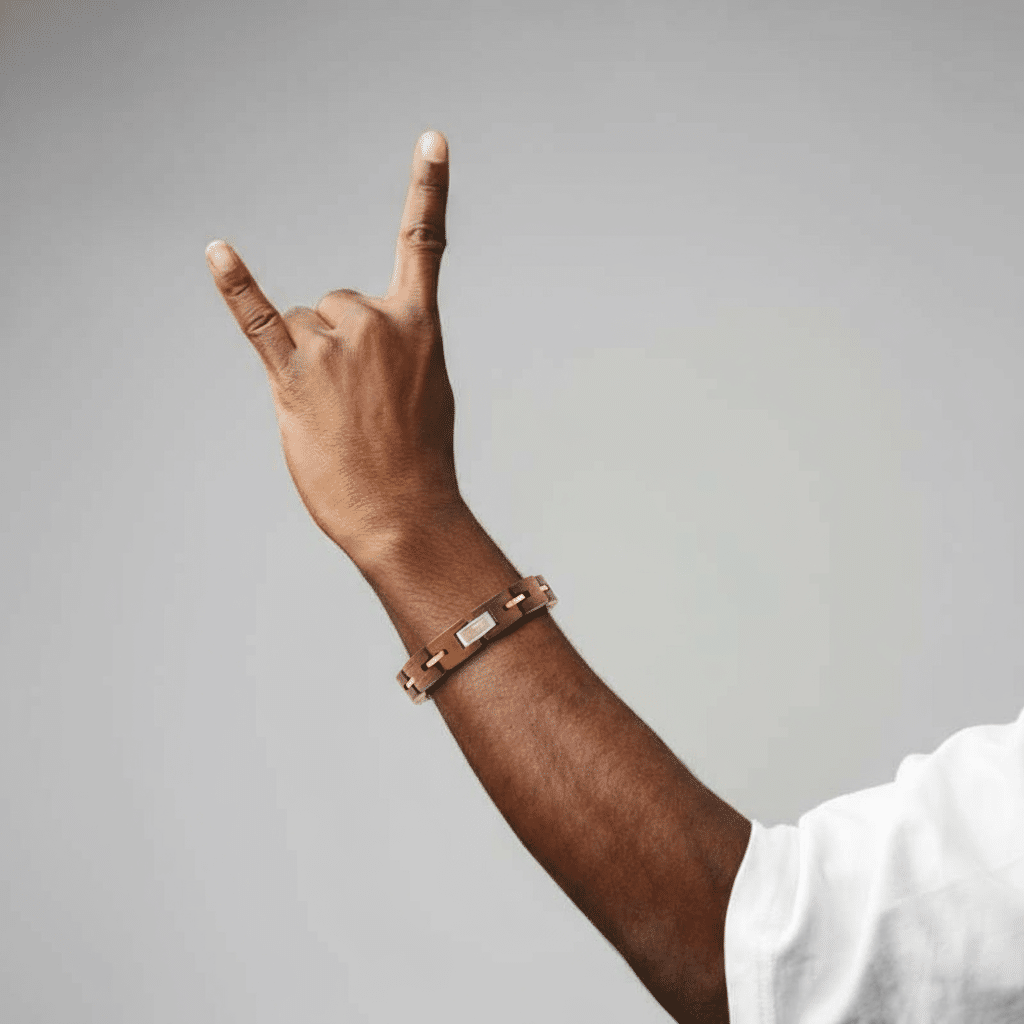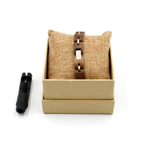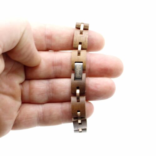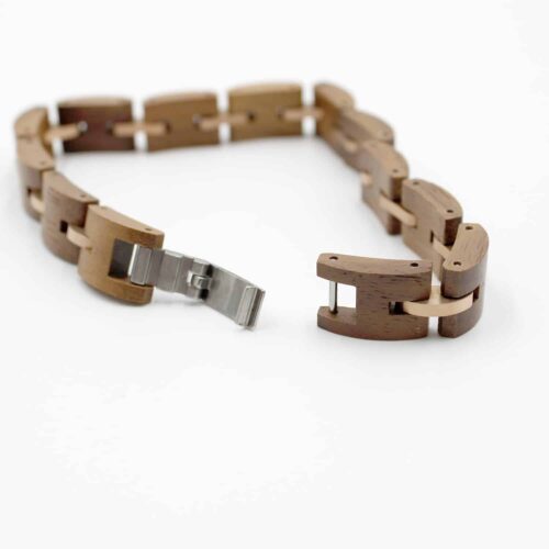 De Shaina armband van Woed combineert tijdloos design met natuurlijke materialen. Gemaakt van hoogwaardig roestvrij staal en Walnoot hout, biedt deze armband een unieke uitstraling. Het middenstuk van roségoudkleurig roestvrij staal zorgt voor een elegante en sterke verbinding tussen de schakels. De schakels zijn 11 mm breed, en met een totale lengte van 220 mm (22 cm) is deze armband geschikt voor zowel dames als heren.